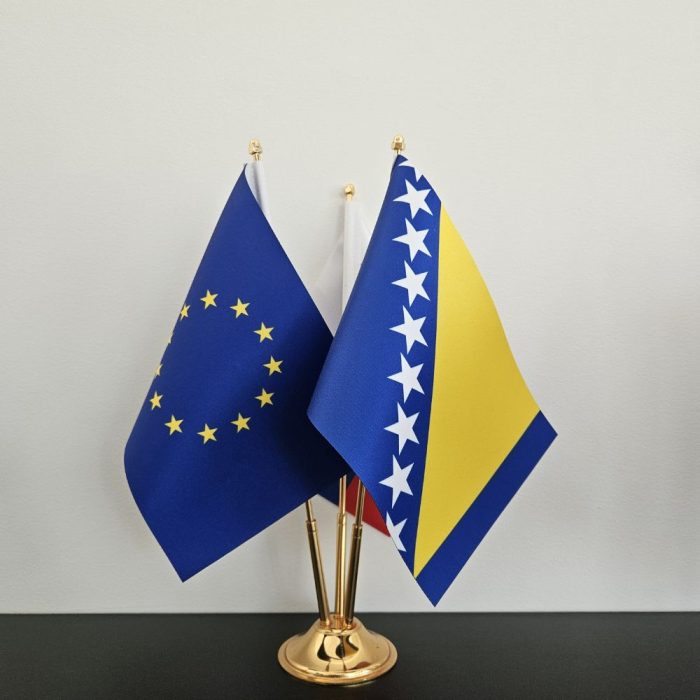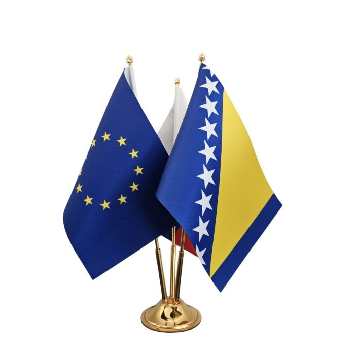 Tri stolne zastavice sa metalnim stalkom zlatne boje.